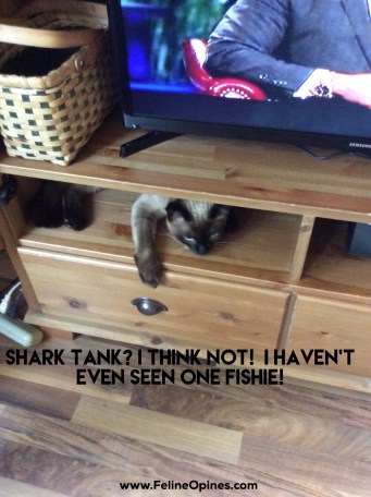 I’ve watched the humans work that clicker thing and I have surmised that opposable thumbs are not required so why don’t they give me a shot at selecting the nightly entertainment?  But nooooo, they call the shots and so I sit and wait to see at least one shark swim by as they watch something called “Shark Tank”.