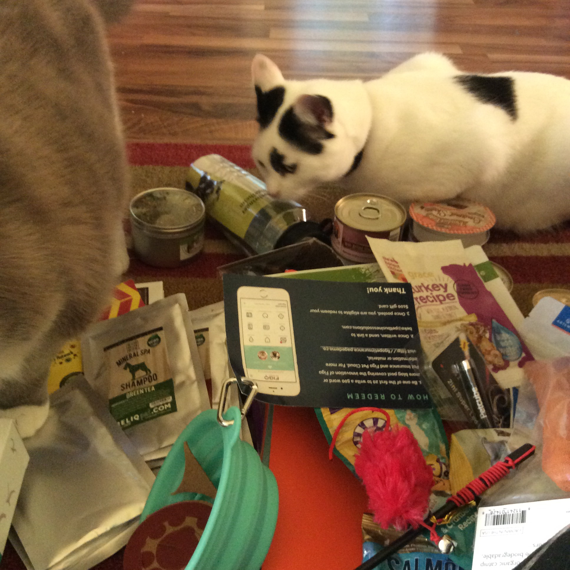 Today ( Thursday) a large box arrived at our door and this was the “swag” of which the female human spoke.  Food, toys, organic catnip, ….this “swag” is good stuff!