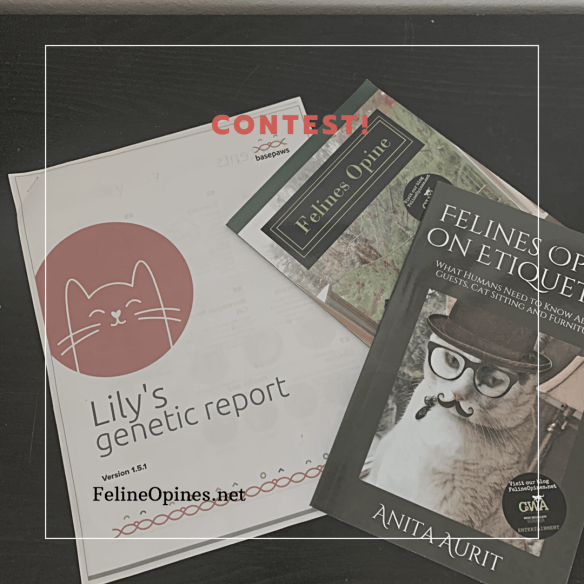 I am running a contest this week (with The Female Human’s help). Just share this post and then note in the comments what 3 breeds you think the basepaws, cat DNA company discovered I am most similar to. The winner with the correct (or most correct) answer will receive our two Felines Opine books (personally pawtographed of course).