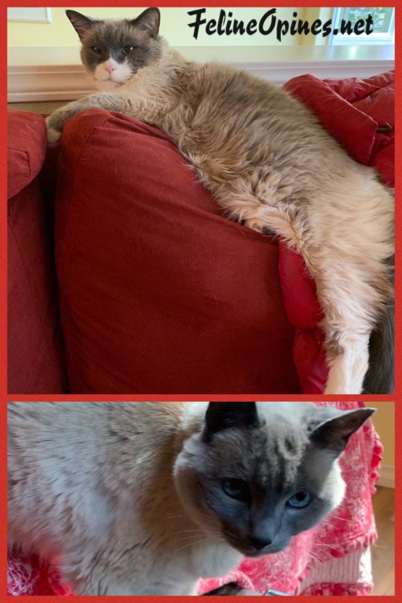 All this upheaval has made us all a bit needy. Me in particular. I regularly demand access to Jasmine’s domain in the bedroom. Here I am looking cute and attempting to tell The Female Human I should be able to stay. Still, despite my cuteness, I am being punished simply because I stretched out my unusually long legs and kicked Jasmine off the end of the bed and across the room when she was in a deep sleep. Hey, mistakes happen and look at me, how could you banish me from the bedroom when I look so cute?!