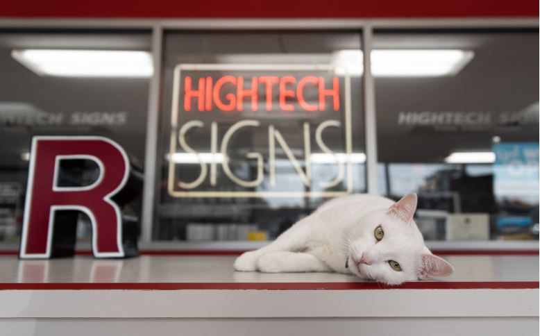 There’s Caspar who works at Hightech Signs whose main job is as customer greeter. He positions himself by the door ready to meow at everyone who comes in. If the customer doesn’t respond to Caspar’s meows, he will meow again until the human gets the message.