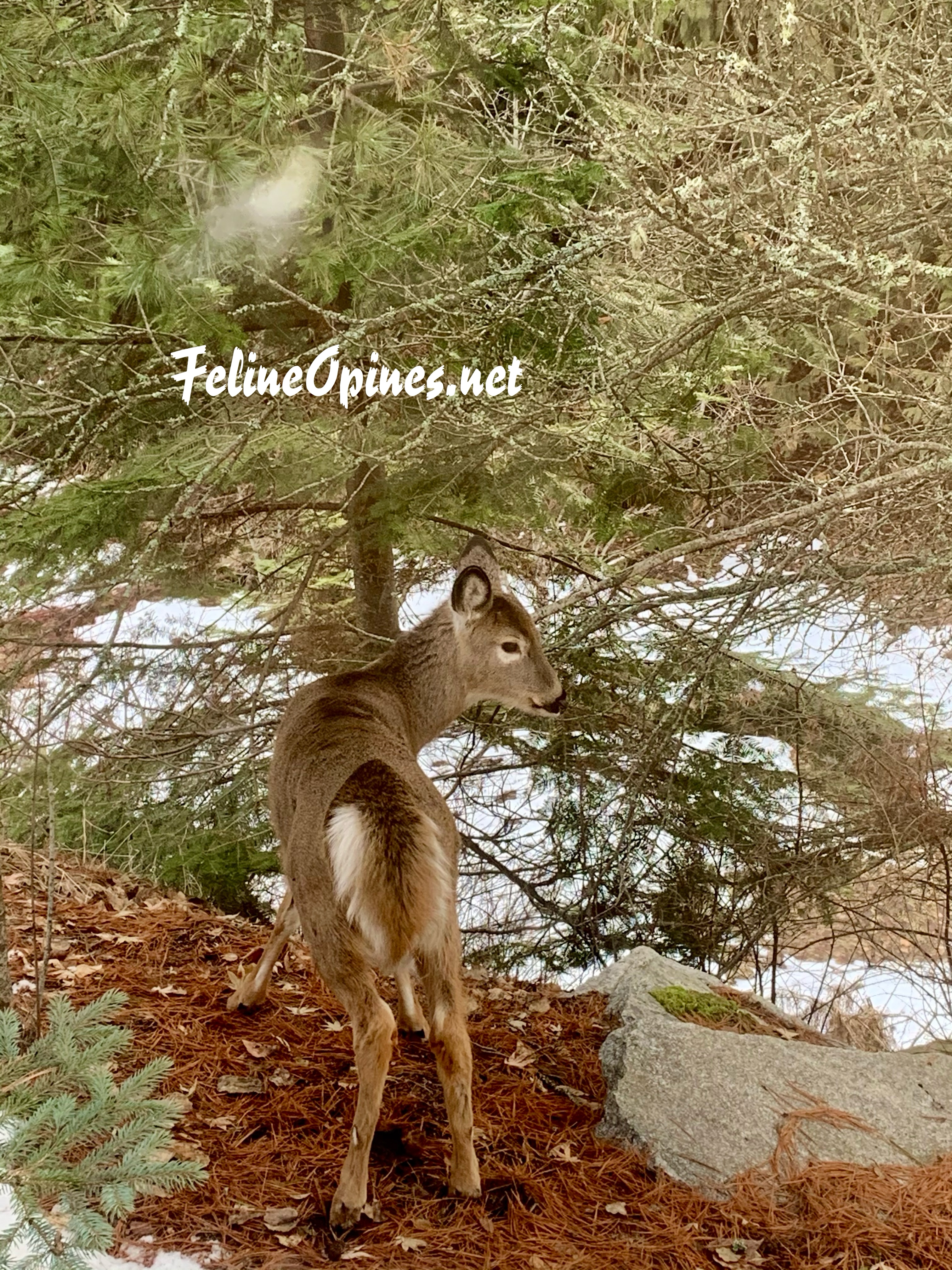 I wanted to clarify that when I refer to “our neck of the woods” I mean that literally and the woods offer great entertainment for The Tribe. The Human flung open the bedroom curtains and found this little guy stretched out on the pine needles sleeping!