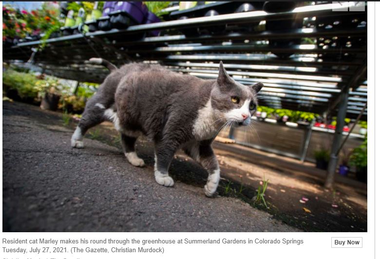 Working cats rock and Marley draws customers to Summerland Gardens in Colorado Springs for the plants-and the feline. Marley is a hard worker, on the job every day either at the front counter, hanging out in a box of seeds or patrolling the place, looking for pets and skritches.