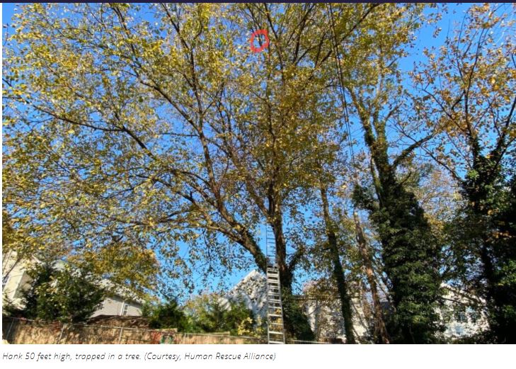 When it became clear that Hank was definitely stuck in a very tall tree, Smaantha Miller,a spokesperson for the Humane Rescue Alliance in D.C. said, “Having found no other option, we had to get creative.”