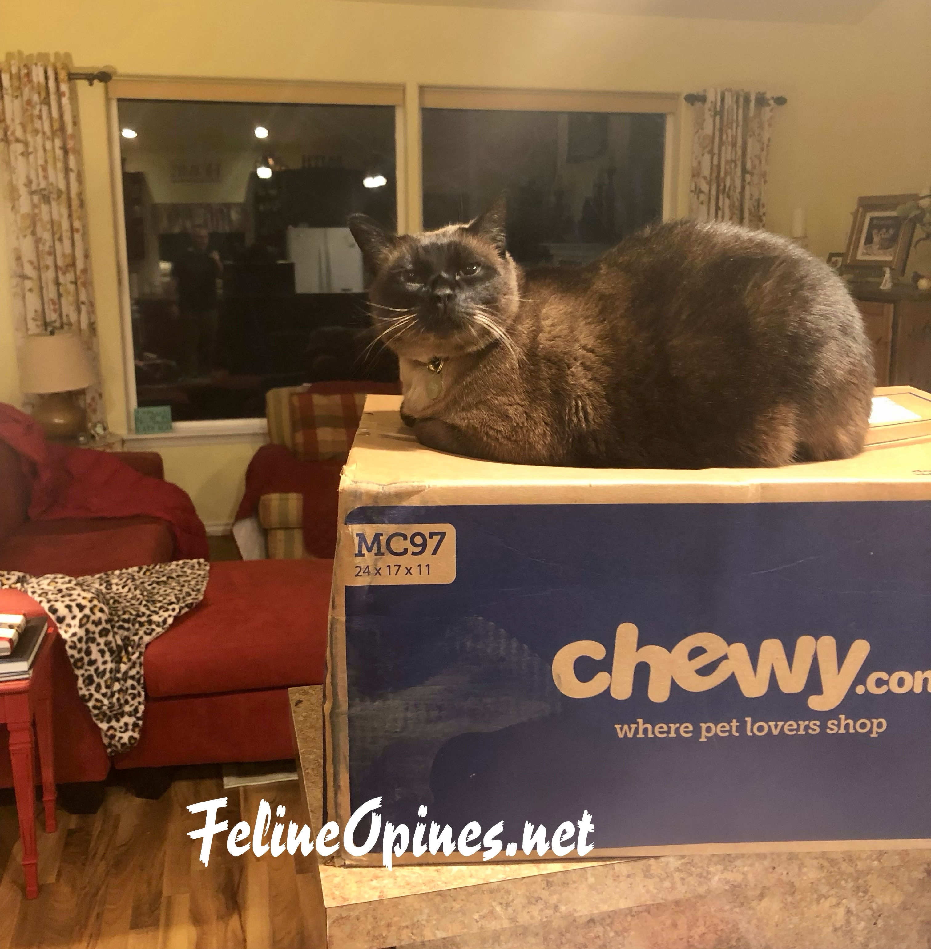 To illustrate how bad the service has been, take a look at this photo. This Chewy box had been sitting on the counter since the delivery human brought it in the morning. I had to wait until The Human arrived home in the evening to obtain access to all the goodies inside, including the catnip. This is unacceptable!