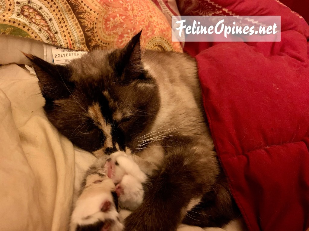 It’s always nice to get cozy and sometimes this really makes The Human happy. For instance, she came home from work on evening and when she saw this she got leaky eyes. She knows how long Lily has wanted a cuddle buddy since Angel Tucker crossed The Rainbow Bridge and to see her cuddling again made The Human very happy!