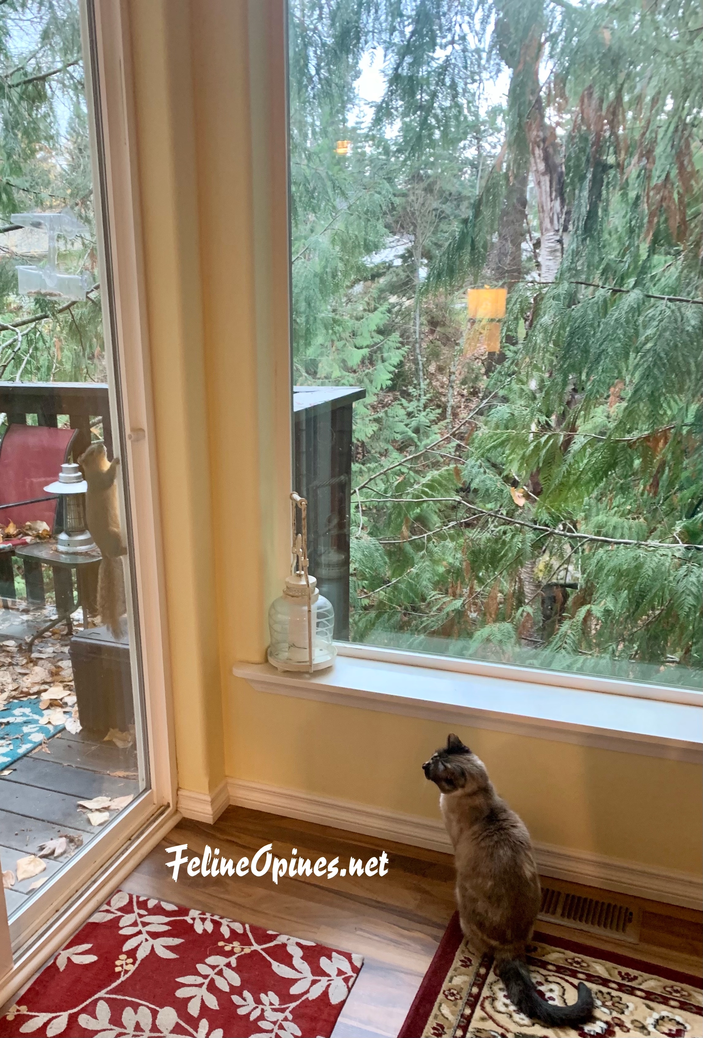 “Listen buddy, don’t sit there and mock me. All it takes is a little movement of those sliding glass doors and you’re history. Hmmmmm, gotta’ tell The Human to get out there and clean up those leaves.”