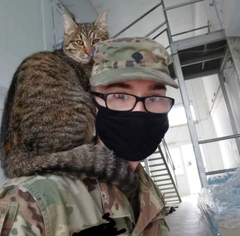 This is the situation with Spc. Kaiden and his furiend, a striped tabby named Tiger. Kaiden went to great lengths to befriend the frightend feline and soon, Tiger trusted him enough to sit on his shoulders.