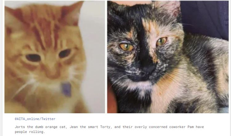 Epic coworker spat over two workplace cats, Jean and Jorts, just keeps getting funnier