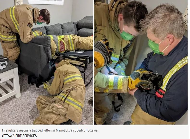 A group of firefighters from Manotick, a suburb of the Canadian capital Ottawa, were called out to reports of a trapped kitten—which had somehow managed to get its leg stuck inside a pull-out sofa.