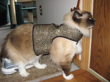 The Human is very meticulous and cheap…er…thrifty so she spends hours researching things before she buys them. When she ordered the harnesses (and measured us) she ended up buying the Kitty Holster Cat Harness. She got both of them in the red bandana fabric and we even got red leashes to go with them. She had to order the XL and here are some photos of the harness on larger cats. We’ll post our own once we get them and we go for a stroll.