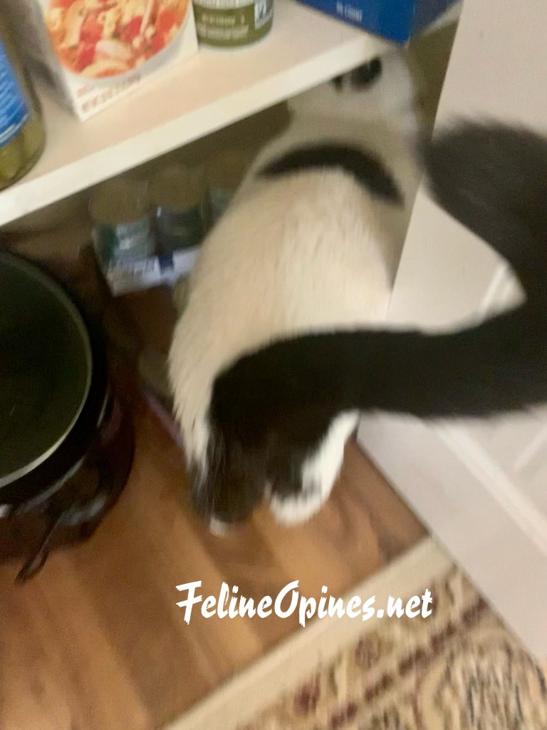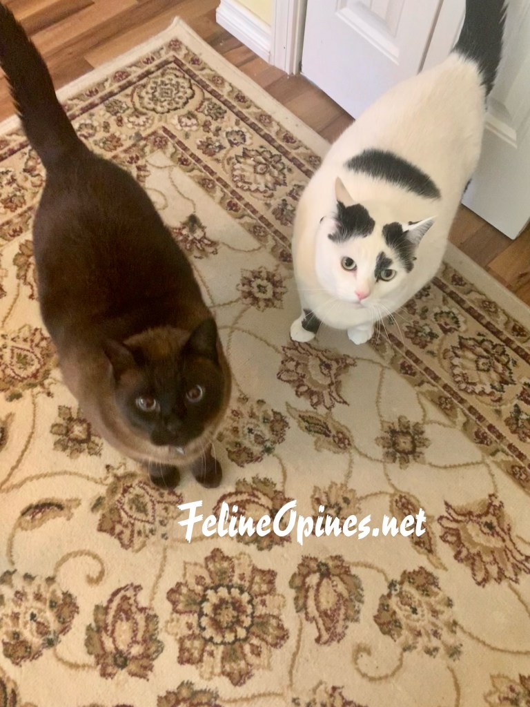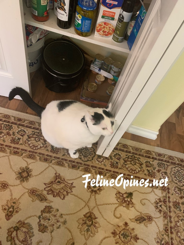 “So Human, we’d appreciate it if you would serve our morning wet food BEFORE you make the coffee“Come on, just follow me to the pantry.”“Oh wait, is that one of the Friskies treats I missed last night? Hold on Al, I be over tere in a minute.”“Allow me to open the pantry door for you. You’ll notice the wet food is on the lower right.”“Here, let me show you which one I want.”