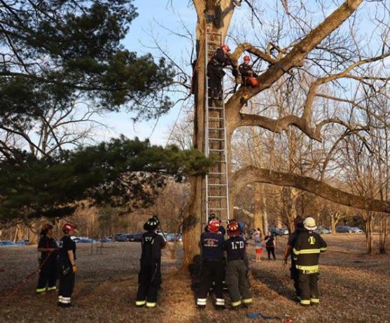 The firefighters used a rope system to get Owen down and he was pronounced fine after medics checked him out. The cat watched the rescue but made no indication he wanted to come down. The cat’s human ended up having to hire a private company to retrieve him from the tree.