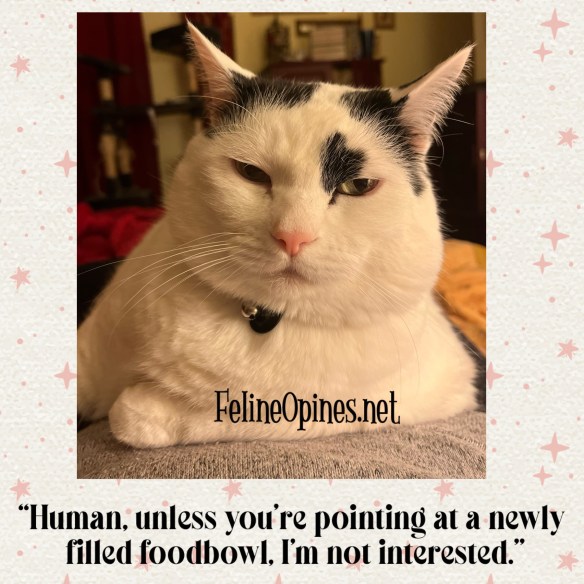 Now here’s something new and different, some scientists have gotten together and studied how we cats respond to you humans when you point. This kind of study has been done with dogs but, as usual, we cats were left out of the scientific loop.