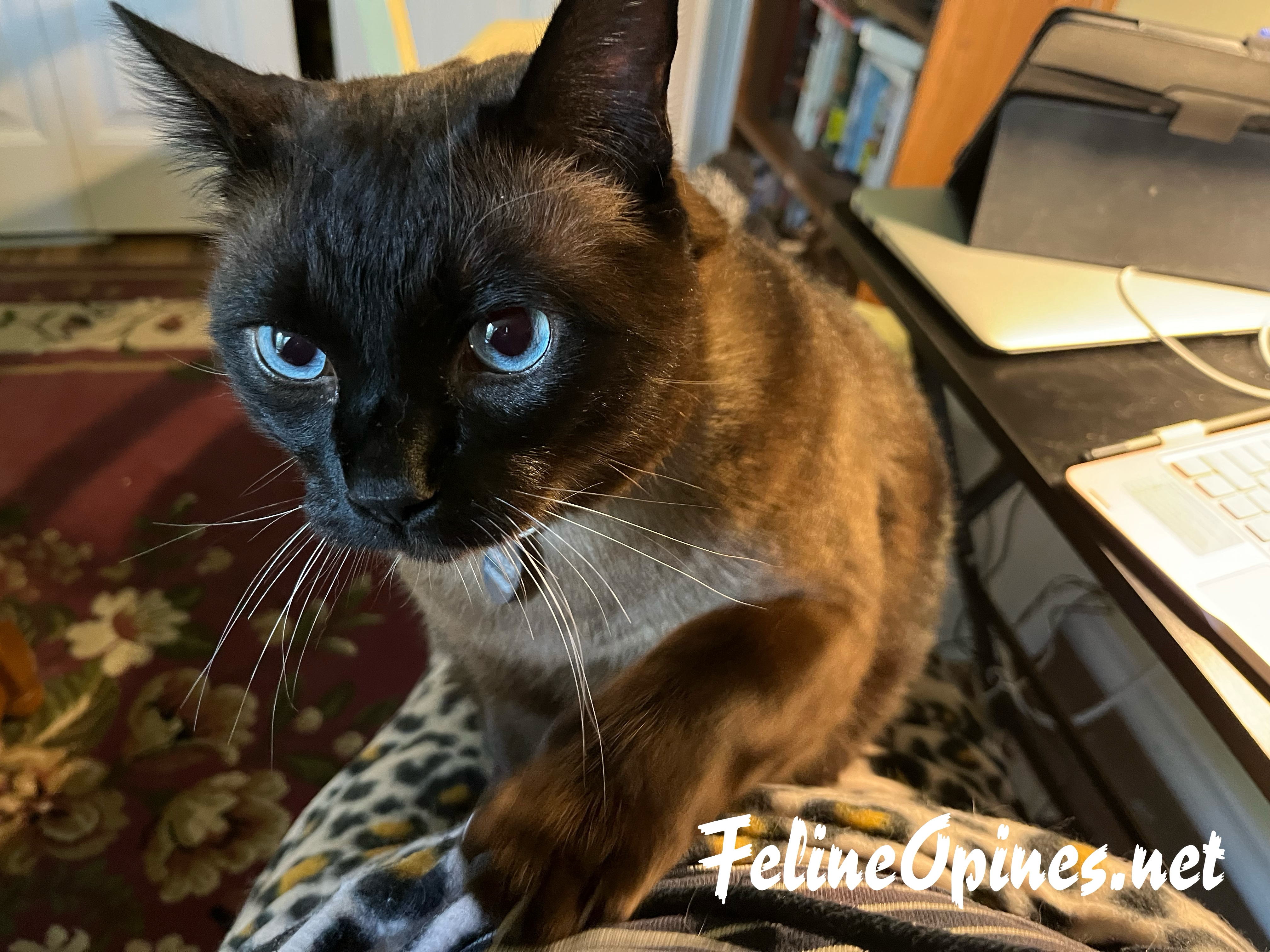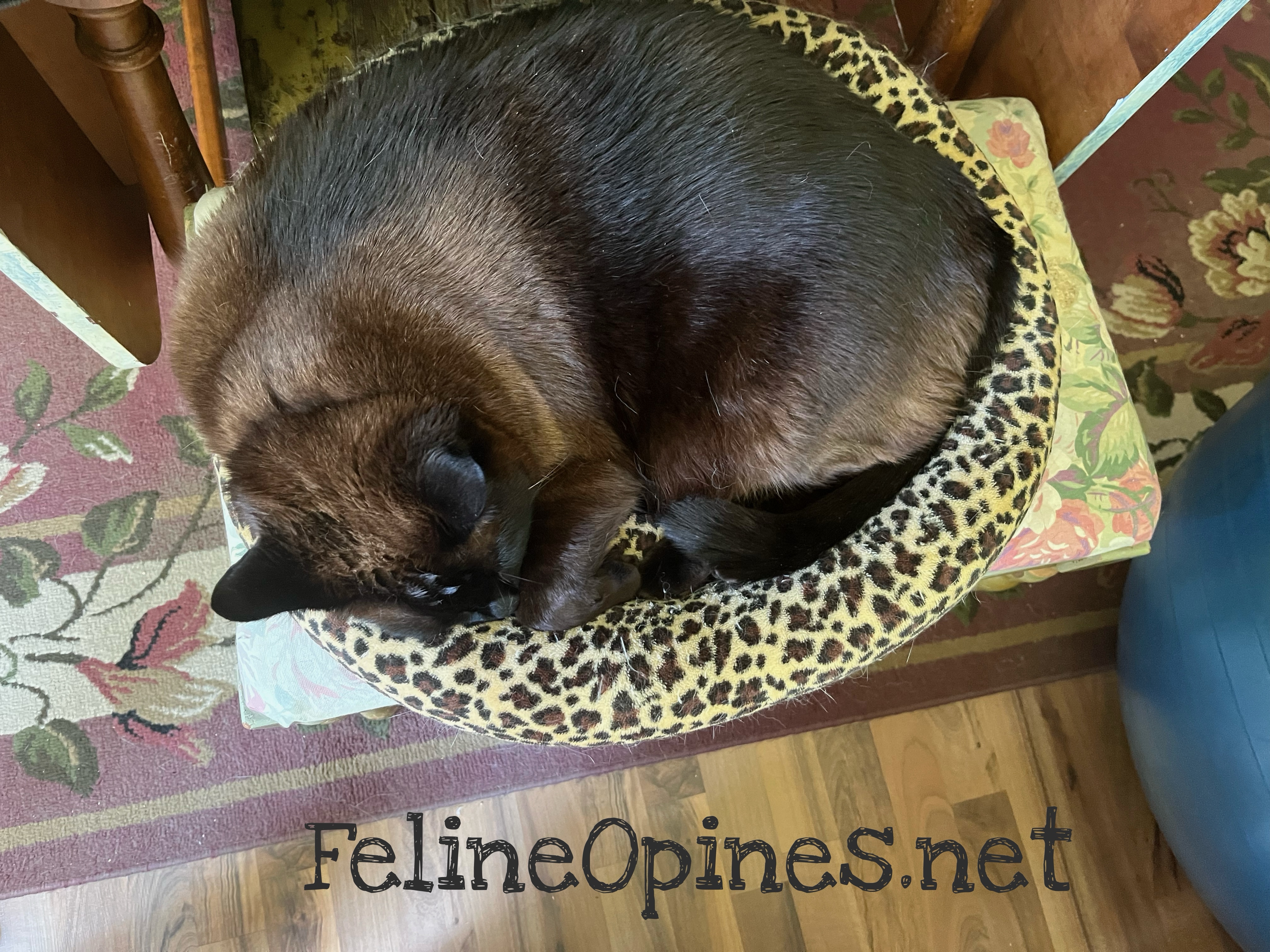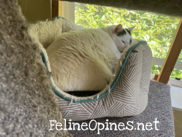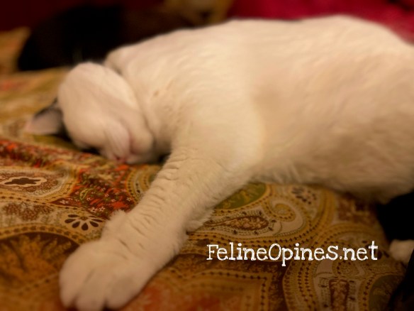 The article claims that cats improve their human’s sleep quality but when we discussed this with The Human, her response was a resounding, “Oh heck no!” This may come from the fact that she has two 21 pound and one 8 pound pile of furry, purry, neediness in bed with her, on top of her, beside her and stretched out on her legs causing temporary paralysis.