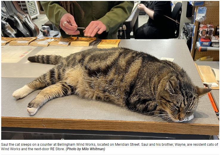 When you shop in The RE Store or Bellingham Wind Works you may hear the soft tinkle of a cat bell, or two cat bells. The bells belong to Wayne and Saul, brothers who found furever homes in the neighboring stores in Bellingham’s Fountain District.