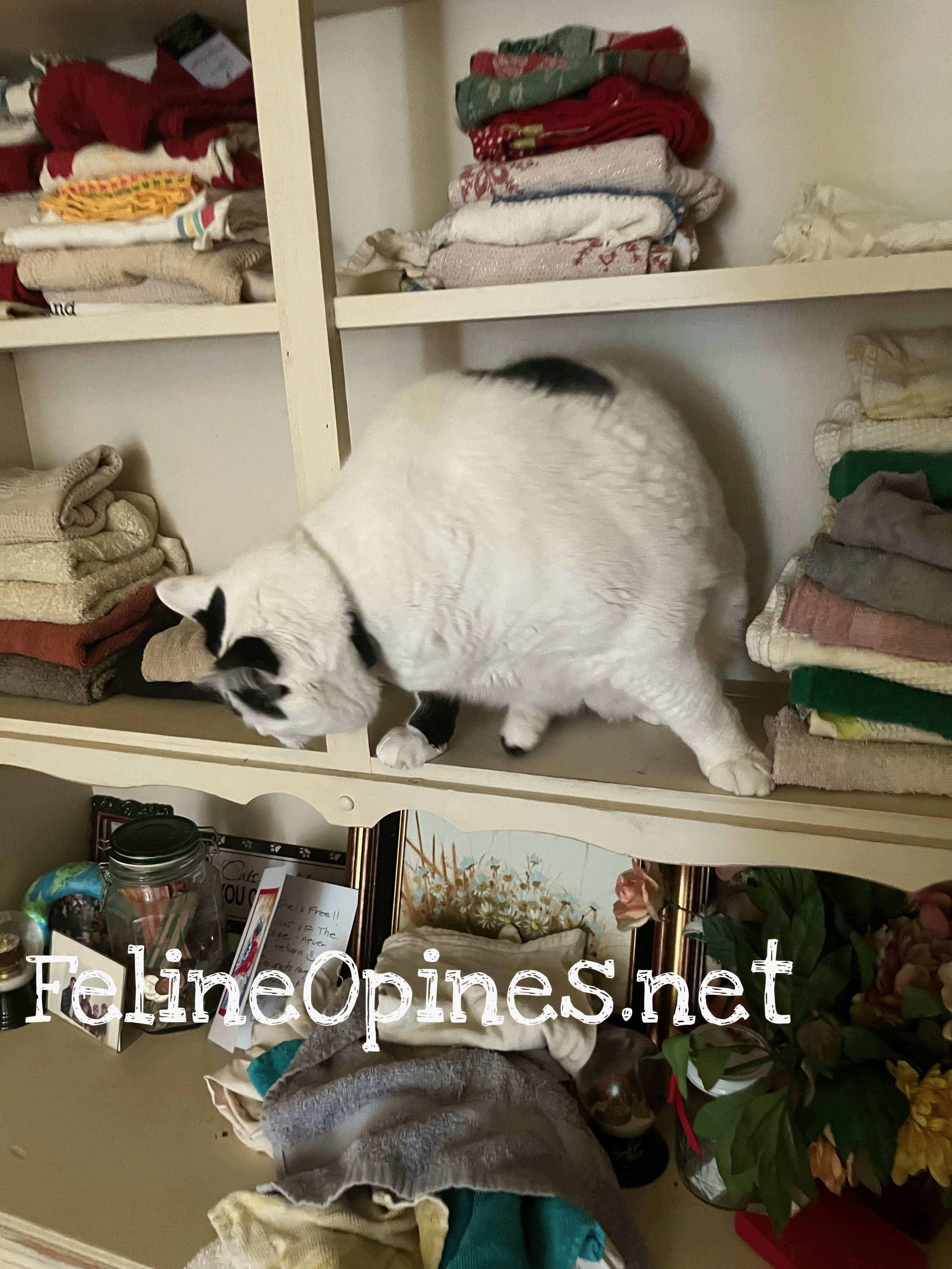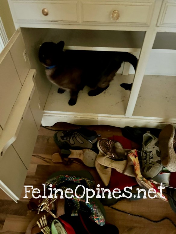 Assisting in cupboard reorganization is a task that truly needs feline snoopervision, MOL!