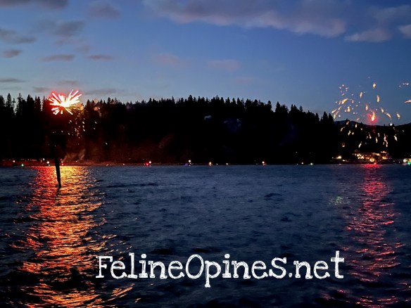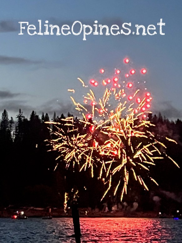 The Human went to watch the loud distressing fire bombs at our human aunt and uncle’s house and we were quite content to stay home and snooze under the overhead fans in quiet peace.