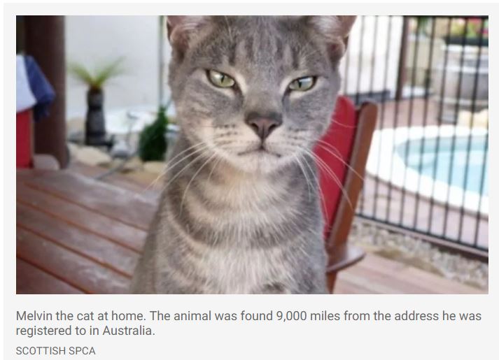 After picking the cat up and giving him veterinary attention, the Scottish SPCA checked his microchip, only to find he was registered to an address all the way in Australia.