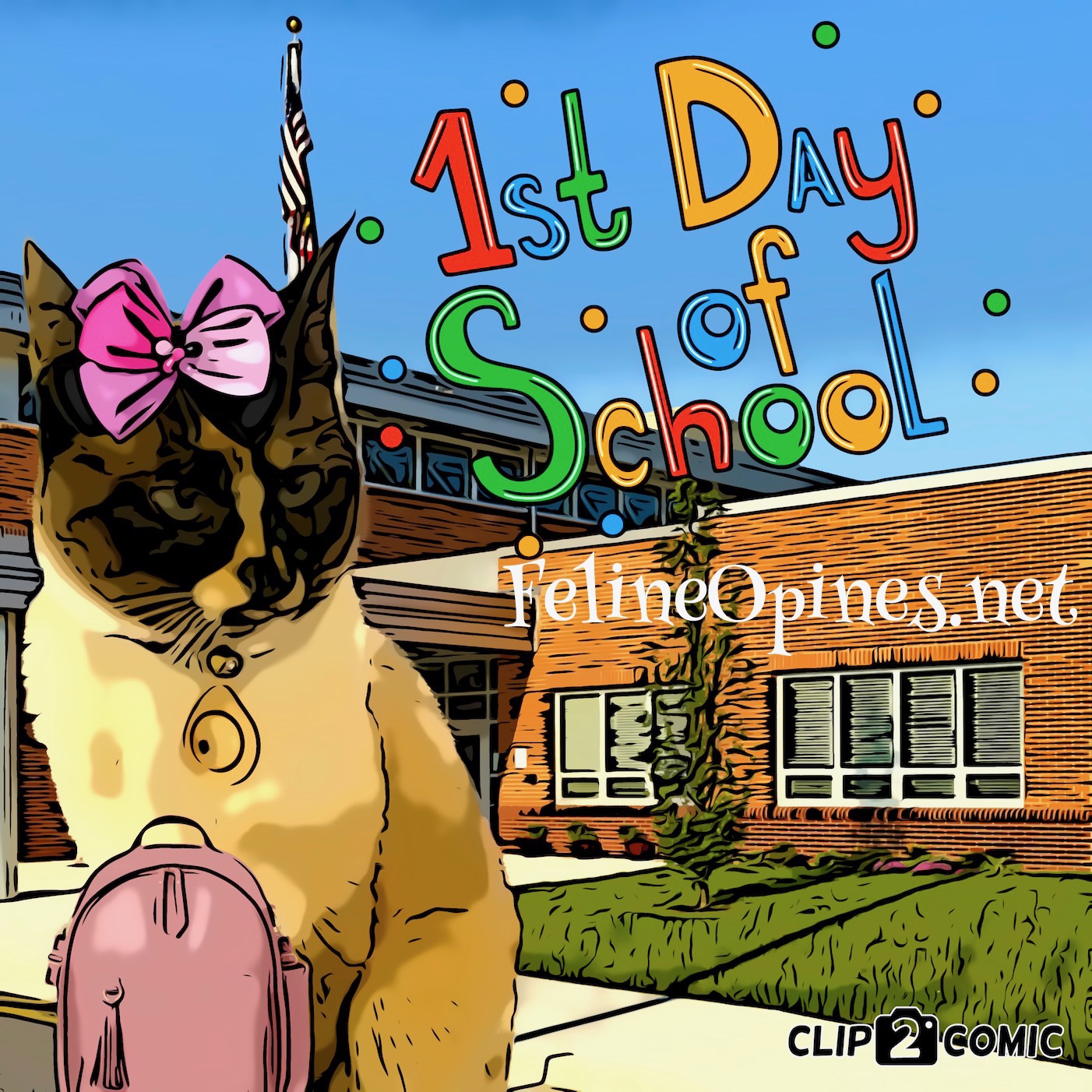 We sure have been seeing a lot of you meowing about your human kids going back to school. We felines are glad we don’t have to go to school but we were wondering what it might be like if we did. We had The Human use her new app Clip2Comic to create some cartoons of the three of us on our first day of school. We hope you enjoy.