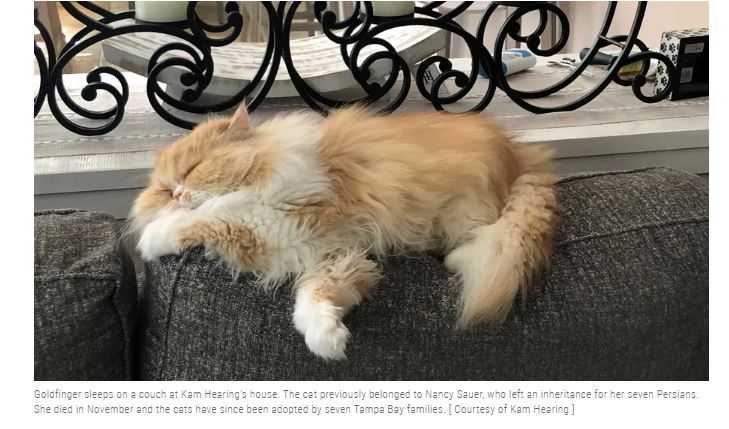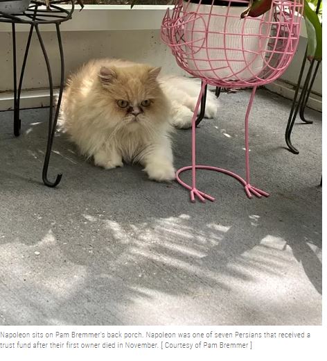 A few months ago I reported on the feline family of seven Persian cats in Tampa Bay whose human stipulated in her will that they were supposed to live in her house until they died. This was financed by a trust fund. And the cats did live in the house from November of 84 when she died until May.