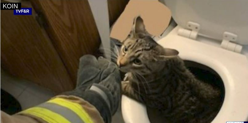 Two paws up to Tualatin Valley Fire and Rescue, Station 53 in Oregon, who extricated this feline stuck in a toilet bowl. They were called after his human’s efforts to get him out didn’t work.
