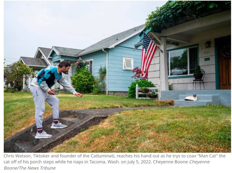 Whenever Chris Watson walks his neighborhood and says, “Here, kitty-kitty,” cats come running. Chris is a cat whisperer, a Pied Piper of felines, Catluminati. Watson has become a social media sensation, racking up millions of views of videos showing his near-daily cat walking ritual. He says,. “I just walk through Tacoma neighborhoods, and I find cats that are friendly, and then I kneel down to them to get them to come visit, and I pet them on camera”