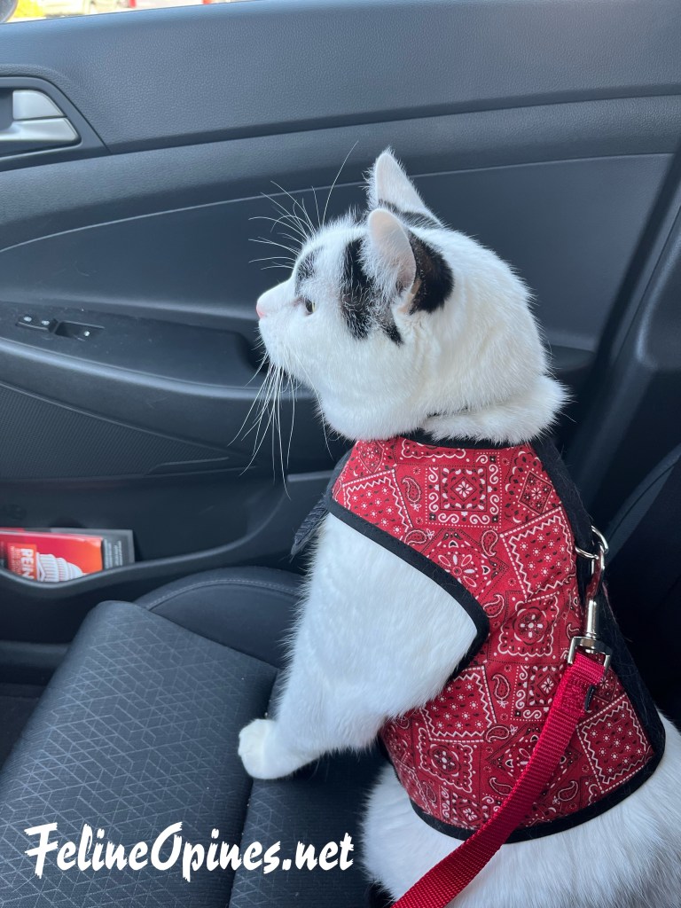 The Human had to take Oliver back to the stabby place for the white coat people to check his progress after his dental surgery. Oliver (and I) purfer to ride in the passenger seat in our vests and leash than to be stuffed inside a carrier. As you can see Oliver did quite well.