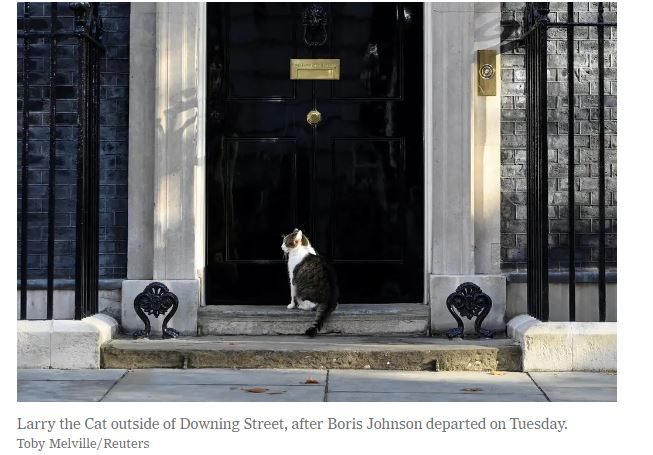Larry even figured in the Conservative Party leadership race. During a campaign event in August, Ms. Truss, Britain’s foreign secretary, noted that she had an “extremely positive” relationship with Larry, saying: “He frequently sidles up to me. I think I’m one of his preferred cabinet ministers.”