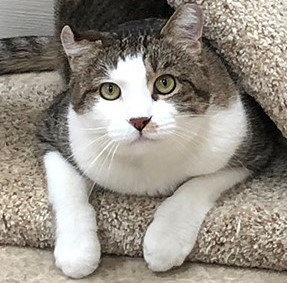 This handsome brown Tabby man cat with brown stripes has quite a history and the fact that his new life suits him is illustrated by his healthy weight, 14 pounds and counting. And by the way, Tyler is the light of his human Jim’s life!