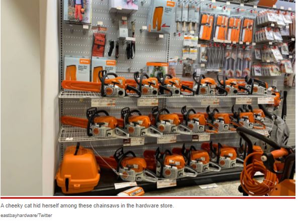The Eastbay Hardware store in Charleston, South Carolina posted a photo on their Twitter account challenging people to find the hidden feline amongst the hardware. Emma, the store cat had found a perfect hiding place and it sure is hard to find her!
