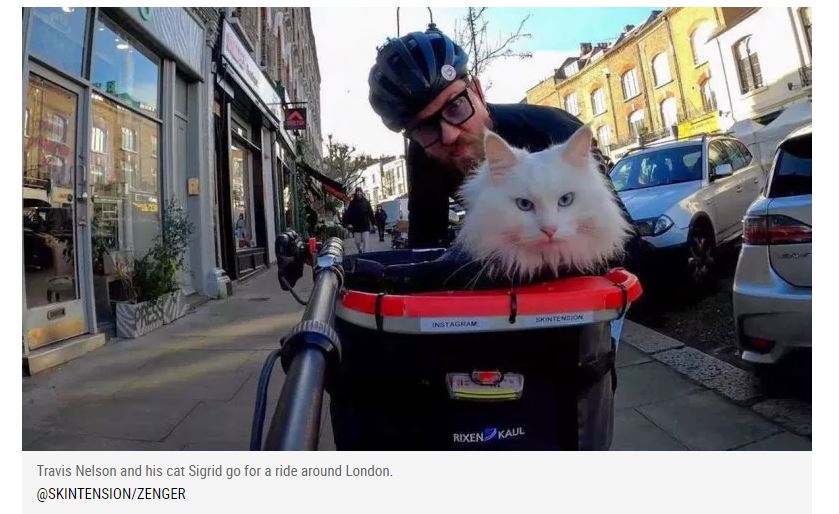 Sigrid the cat helps her human, Travis Nelson make sure no one touches his bike! Nelson is a former San Franciscan who now lives in London. The article provides a video where we see Sigrid enjoying her bike ride in her basket as she seems to warn everyone to keep their distance.