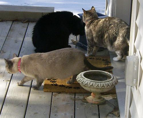 Buster (black cat) and Miss P. exploring the cold, wet stuff.Jasmine (in front with pink collar) and Miss P. & BusterTucker was never a fan of the cold, he purrfered the upstairs deck in the summer