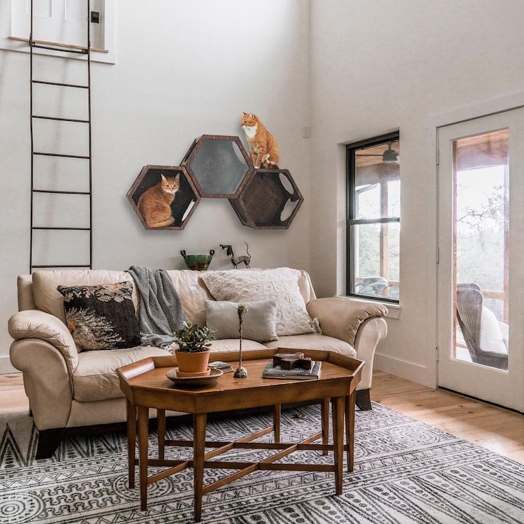 You can custom order your hexagon shelves to have a felt lining, and for those with particularly kingly cats or queenly kittens, there’s even an option to include a pillow. In addition, you can choose to order between one and four hexagons. Within each set, you can also determine how many of them have an acrylic window. This adds an extra sense of security for your cat, and it also lets you still see each other. If you opt for a window, you can even order it to include a printed design.