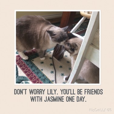 Lily here. After our human shared Amelia’s story I thought I would chime in and continue the story of the ongoing efforts to reintegrate Jasmine into our house.