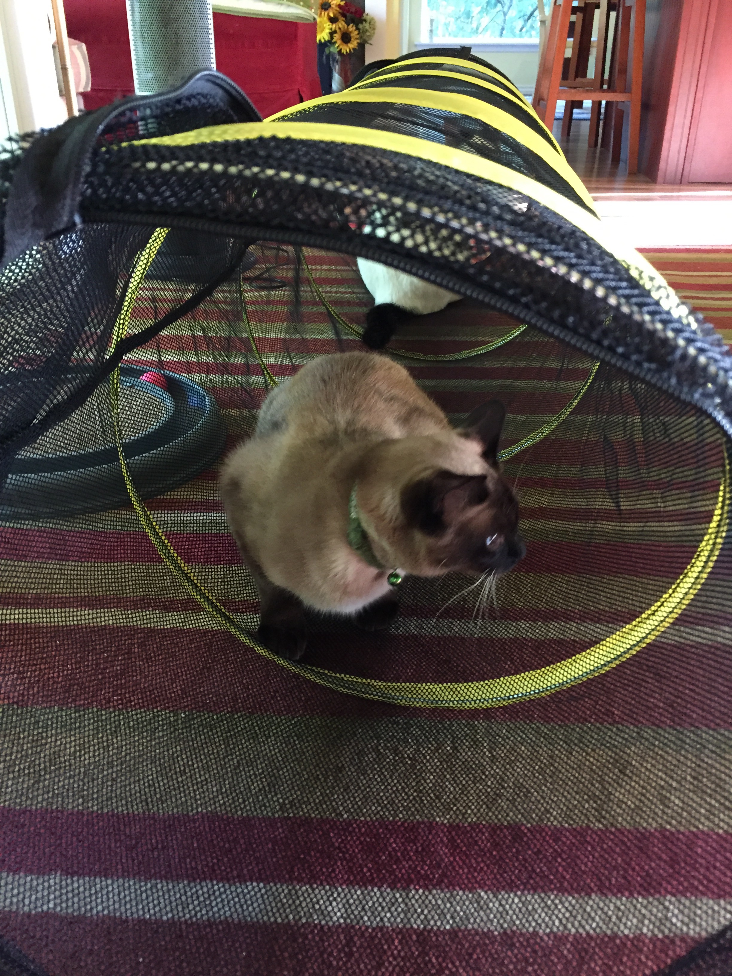 it a paws up. The humans then set themselves the task of removing the kittens and learning how to collapse the tent and fit it back in the skinny black bag. Although I love the humans, I have to say they were a bit slow in figuring it out. Finally, they saw the two (clearly marked with orange) tags where they were supposed to squeeze, when they squeezed, the whole thing folded up and all they had to do was wrap the netting around it to get it back in the narrow black bag.