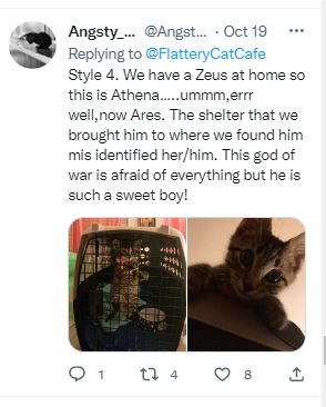 We love hearing how our feline furiends got their names and now, thanks to Flattery Cat Café’s October 19th tweet asking what inspired the naming of their cat, I found some great stories! I was named by someone who was a Tour de France aficionado and my sleekness and speed earned me my moniker. Oliver was the runt of the litter and was so tiny and always hungry when he came to the house with me, he reminded The Human of Oliver Twist, constantly asking, “May I have some more please?” Lily was named after the little girl next door who loved felines but whose dad was allergic. The human Lily could visit the feline Lily whenever she wanted until she moved away.