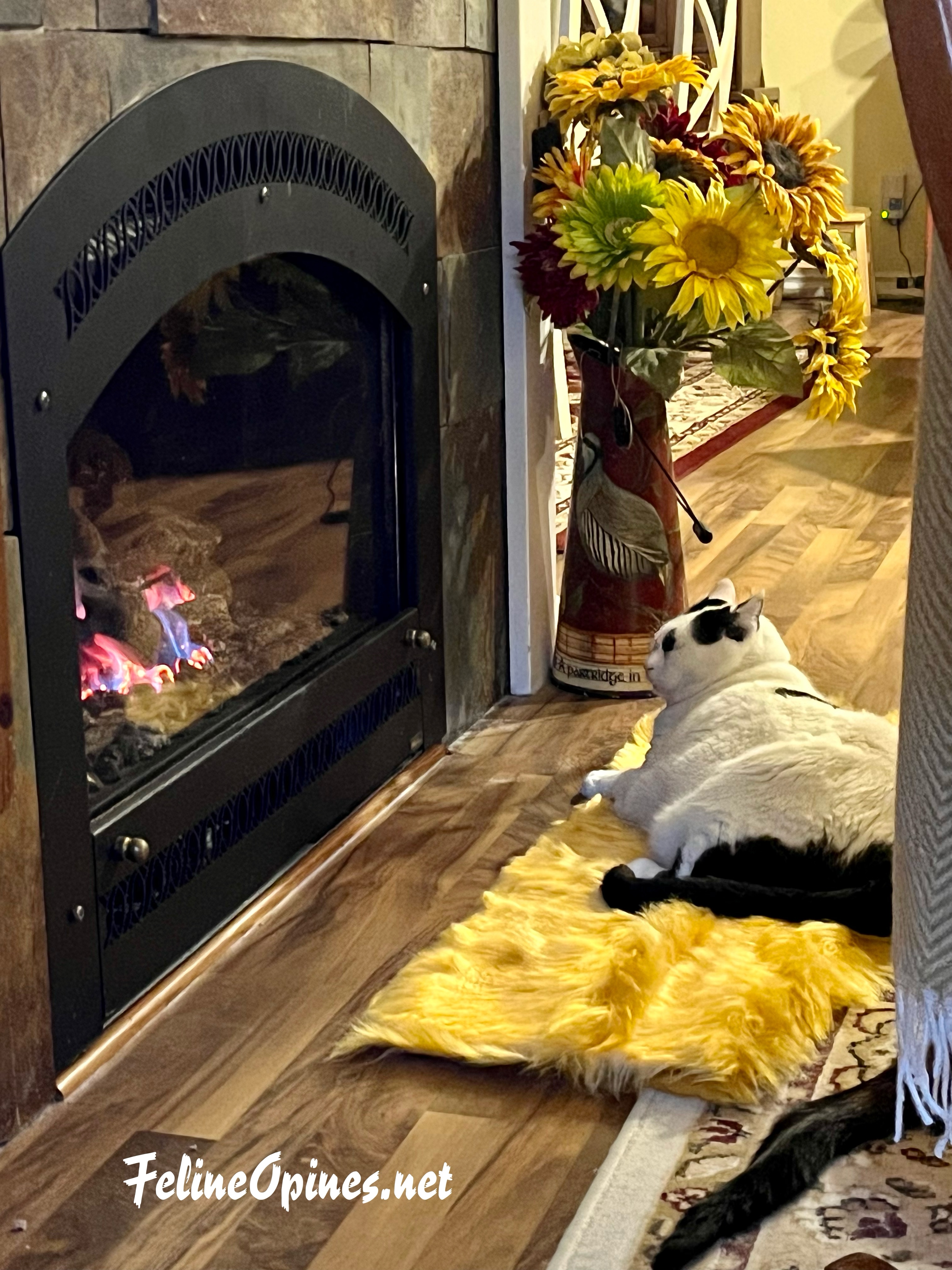 How are things in your neck of the woods? We are settling in to the cozy part of fall and love it when The Human turns on the fireplace. She got us a new fury rug which is quite soft and comfy. I purrfer hanging out on the cat scratcher but Oliver, who always enjoys life’s comforts, has commandeered the rug. It’s pretty clear how he feels about that new rug by the expression on his face.