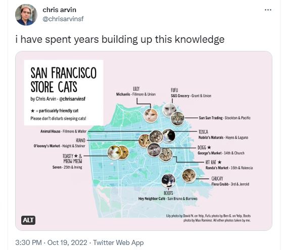 Oh meowza, this human has done a brilliant thing! Chris Arvin’s mapmaking has made him a Twitter star and his latest map is a BIG winner! The map is titled, “San Francisco Store Cats”