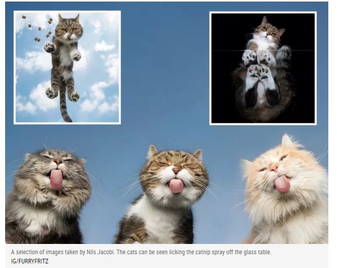 Nils Jacobi sprayed catnip all over his glass dining-room table before getting underneath with his camera to snap the cats in action. Fritz, 14, Kleine, 10, Frederic, and Lissy, both 4, can be seen rolling all over the glass and pulling funny facial expressions.