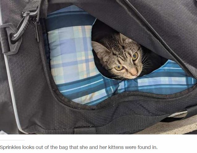 There was a note inside the bag saying that the cat, Sprinkles had given birth the day before. The sheriff’s office took the felines to the Animal Friends Humane Society where they are now warm and fed.