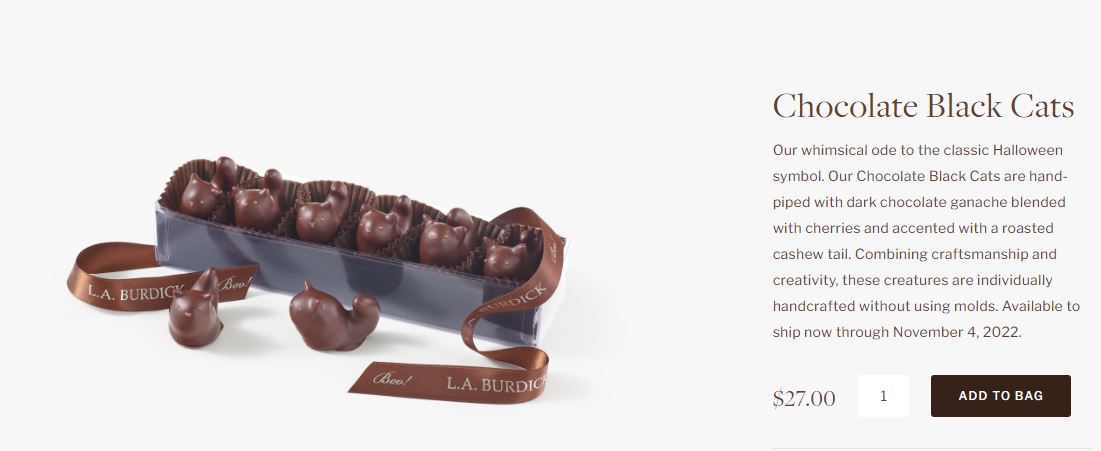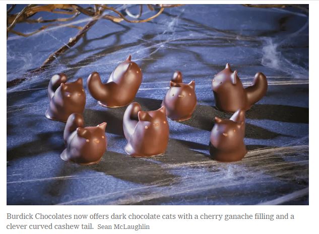 Please note, this product is for you humans only and it’s pretty clever. The Burdick Chocolates menagerie, well known for its silk-tailed mice, now includes cats. The company created dark chocolate felines with a cherry ganache filling and a curved cashew tail. They’re almost two inches long, come six to a box and are being sold for a limited time online and at the L.A. Burdick shops in New York, Chicago, Washington and New England. The box of six chocolate kitties sells for $27.00