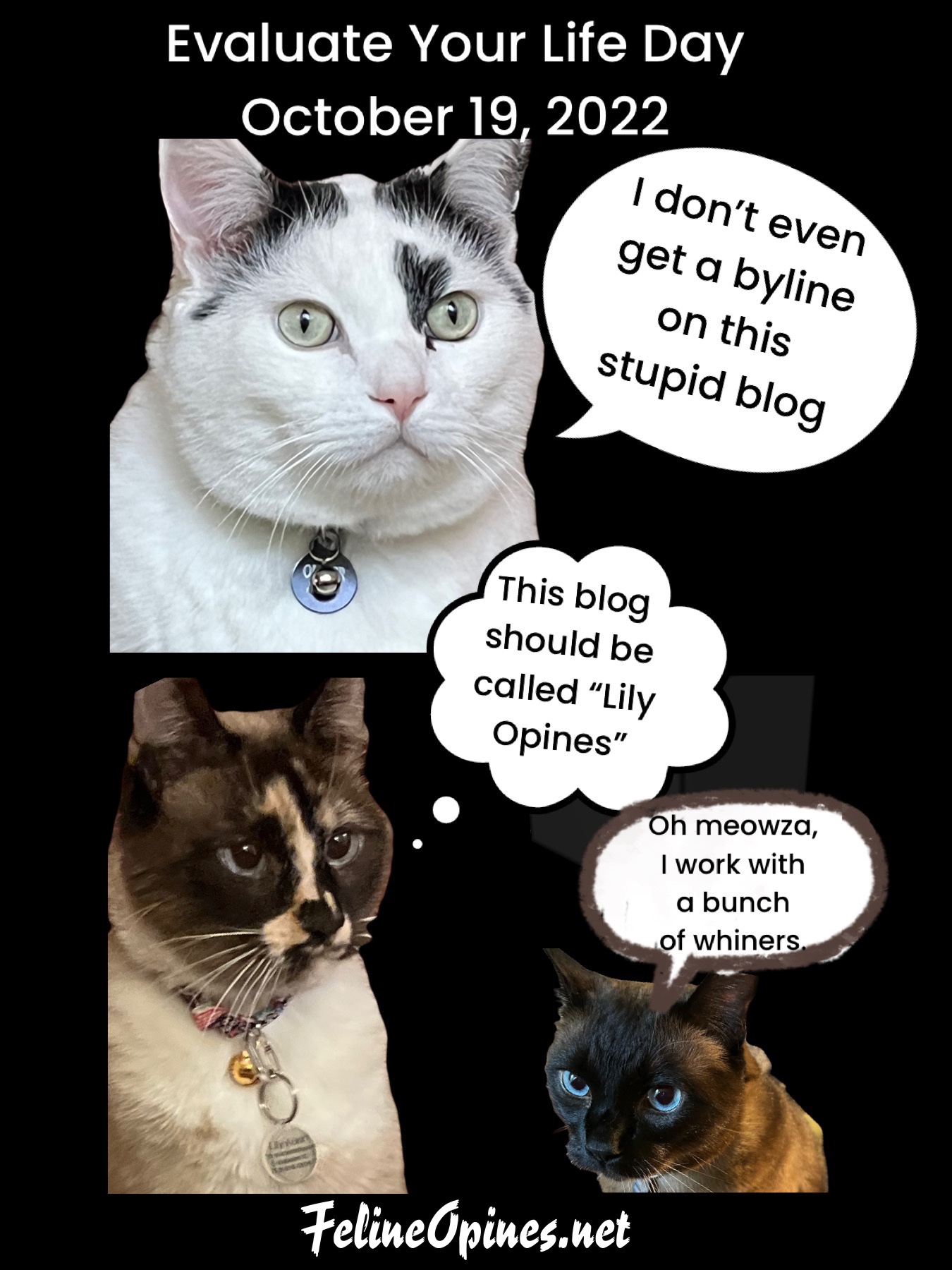 We are always looking for feline “chatters” for this feature. What gets your whiskers in a twist? Do you want to brag about your clowder or your human staff? We’d love to hear from you. Send us a photo and your thoughts and you could be chatting to! (FelineOpines@gmail.com)