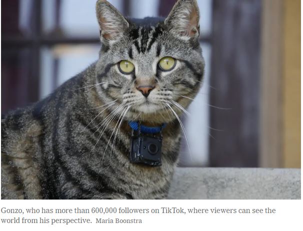 Gonzo isn’t the only cat producer. In Norway, a GoPro-wearing cat roams across snowy meadows or climbs on a roof. One in China also recorded under-the-chin videos. Mr. Kitters has 1.5 million followers on TikTok and nearly one million on Instagram, where viewers can watch him meow at a bird or chase a squirrel.Gonzo’s humans, Derek Boonstra, and his wife, Maria, live in Los Angeles.
