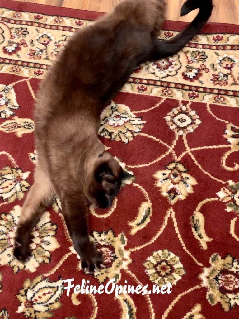 The Female Human purchased a new kitchen rug without our consent. What hubris! I immediately went into the kitchen to see if I would be willing to give it a paws up. I must say I like it much better than the old one.