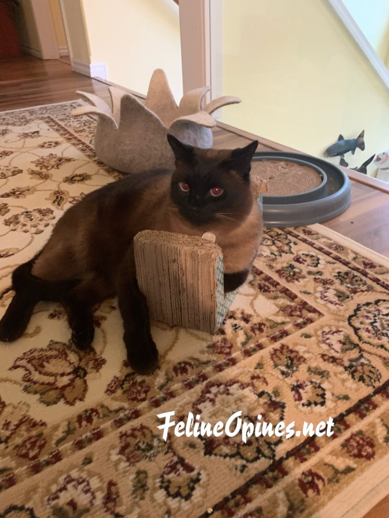 I do have one question for you. I have had this “cardboard sofa” since I was a kitten. It’s my favorite thing to hang out in when I’m chillin’ and keeping an eye on the goings on in the house. The Female Human thinks I should have a bigger one and frankly, it is getting a bit difficult to squeeze my large (but lean and athletic) frame into this one. If any of you know of a larger version of this cardboard sofa, please meow at us and let us know.