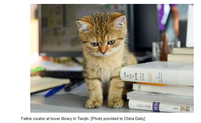 A visitor to the library in Tianjin, China had a pleasant surprise when visiting. The library is located inside Tianjin Tower, which rises to 415.2 meters (over 1362 feet). He found seven cats prowling amongst the bookshelves.