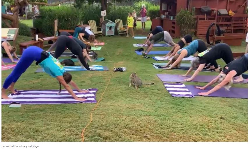 Two paws up for the humans who supported Lana’i Cat Sanctuary at their cat yoga session on the lawn of its shelter. The non-profit incurs costs of almost a million dollars a year to house the 680 cats that live there. They bring in about 200 new feral cats every year but they also adopt out about 100 cats a year.