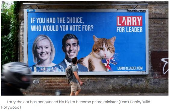 While most humans opine that either Liz Truss or Rishi Sunak, of the Conservative Party will be the winner the #Larry4Leader organization is making sure he is considered in the race.